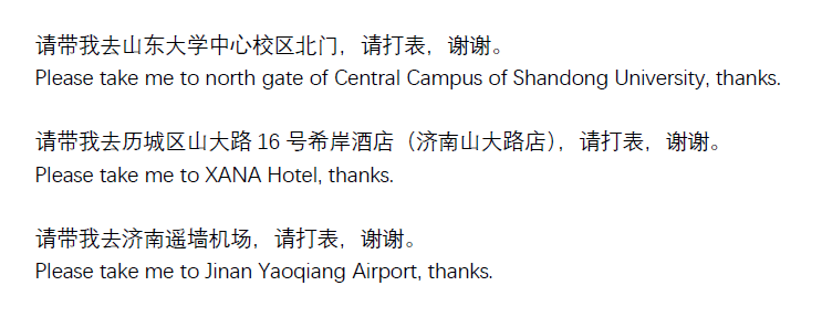 The following are some items of information both in English and Chinese. You may print them out and show them to taxi drivers or others when you are in China.